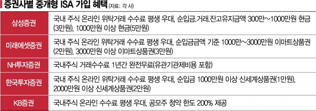 수수료와 공모주 청약 우대 등 증권사 이벤트도 중요한 고려 요소다. 대다수 증권사들이 국내주식 거래 수수료 평생 할인 혜택을 제공 중으로 기본적으로 유관기관제비용인 0.0036%만 가입자가 부담토록 하고 있다. NH투자증권의 경우에는 이마저도 1년간 무료를 선언한 상태다. 계좌 잔고 유지 조건에 따라 현금이나 백화점 상품권 지급 등의 혜택도 받을 수 있다. 공모주 투자에 관심이 많은 투자자라면 KB증권이 좋은 선택지가 될 수 있다. KB증권은 현재 중개형 ISA에 가입하고 2000만원 이상 잔고를 유지하는 고객에게 공모주 청약 한도를 200% 늘려주는 혜택을 제공하고 있다.