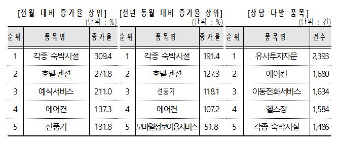 20일 한국소비자원과 한국소비자단체협의회는 지난달 1372소비자상담센터에 접수된 소비자상담을 분석한 결과 '각종 숙박시설' 관련 상담이 1486건으로 전월 대비 309.4% 증가했다고 밝혔다. ‘호텔·펜션' 관련 상담은 1439건으로 271.8% 늘었다.