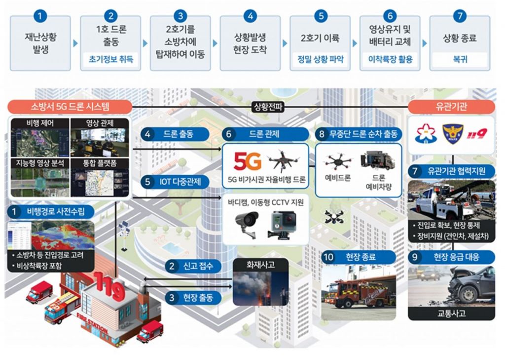 재난 현장에 먼저 출동하는 드론이 도로 현황을 확인해 소방차 등이 최단 거리를 이용할 수 있도록 하고, 현장을 촬영한 3D 입체 영상을 공유해 효과적인 구급·구조활동을 돕게 된다.