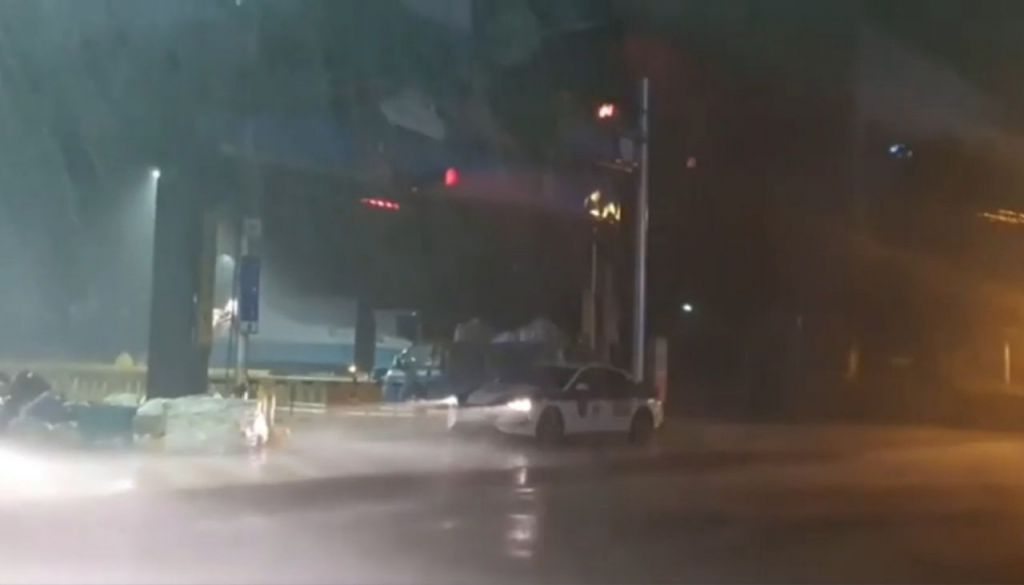 제12호 태풍 '오마이스' 영향권에 접어든 부산에 비바람이 거세지면서 저지대 도로 차량통행이 통제되고 있다. [사진=부산경찰청 제공]