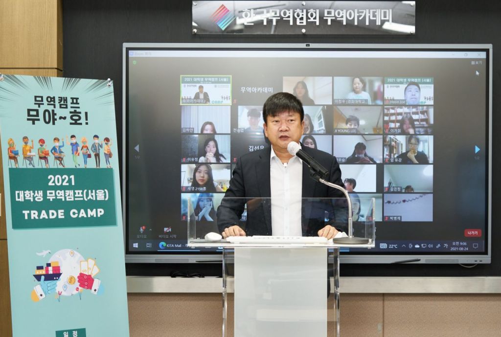 한국무역협회가 24일 개최한 '2021 대학생 무역캠프' 서울지역 입교식에서 장석민 무역아카데미 사무총장이 인사말을 하고 있다.[사진제공=무역협회]
