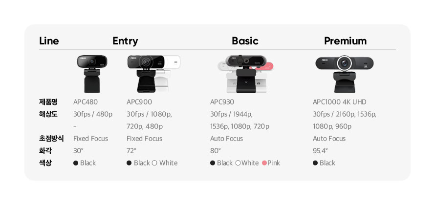앱코 웹캠 제품 라인업 (왼쪽부터 APC480, APC900, APC930, APC1000)