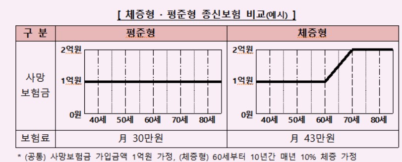 체증형 종신보험이란 사망보험금 지급액이 전 기간 동일한 평준형과 달리 가입 후 일정기간 경과시 보험금이 증가하는 종신보험이다. 다만 사망보험금 증가분이 보험료에 반영되므로 보험료가 평준형보다 비싸고, 주로 무·저해지형으로 판매돼 중도해지 시 금전적 손실이 확대될 수 있다.