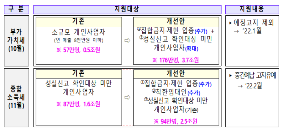 세정지원 및 그 대상도 확대한다. 정부는 부가가치세(10월)와 종합소득세(11월) 납부기한을 각 3개월씩 연장하기로 했다. 아울러 기존 연 매출 8000만원 이하 소규모 개인사업자 (부가세) 및 성실신고 확인대상 미만 개인사업자(종합소득세)로 한정됐던 지원 대상을, '집합금지·제한' 업종이라면 모두 적용되도록 그 대상을 확대했다. 종합소득세 납부유예의 경우 착한임대인도 포함된다.