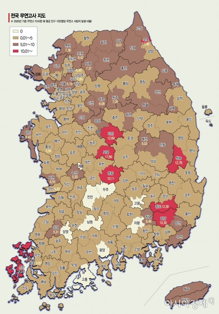 아시아경제가 전국 229개 기초자치단체를 전수조사해 '무연고사 지수'를 분석한 지도