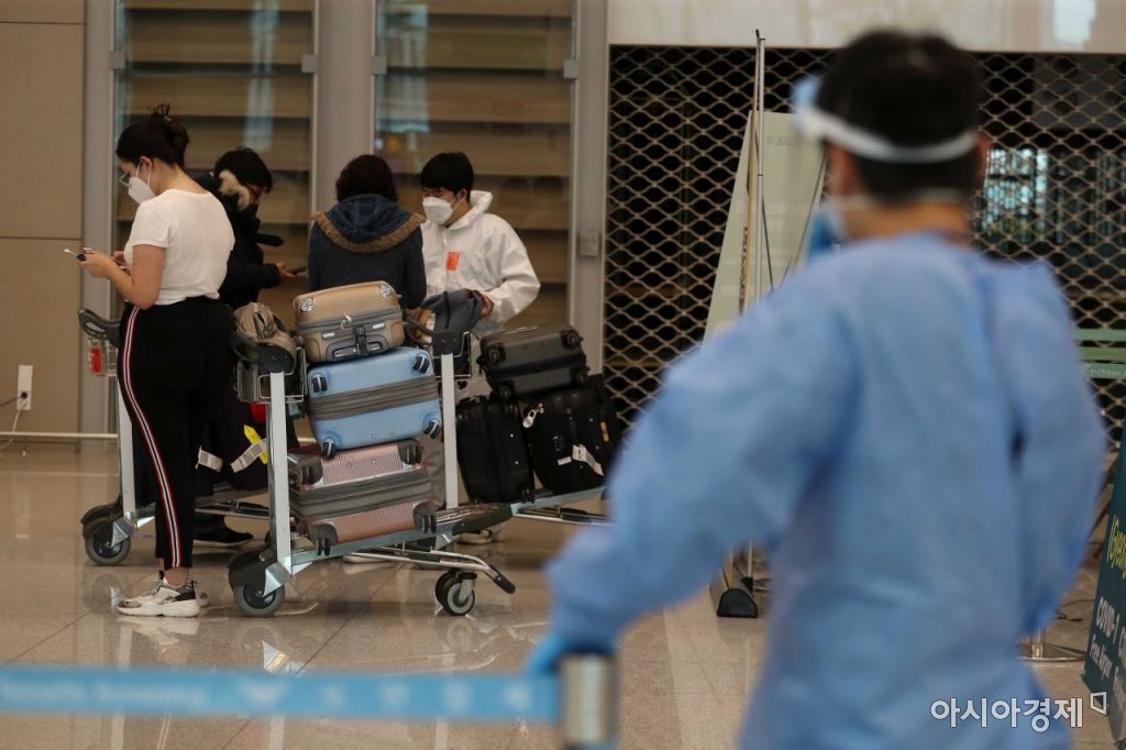 13일 인천국제공항 2터미널 입국장에서 해외 입국자들이 교통편 안내를 기다리고 있다. 질병관리청 중앙방역대책본부는 이날 0시 기준 국내 누적 확진자는 1990명 증가한 22만182명이라고 발표했다. 국내 발생 확진자는 1913명, 해외 유입 확진자는 77명이다. /문호남 기자 munonam@
