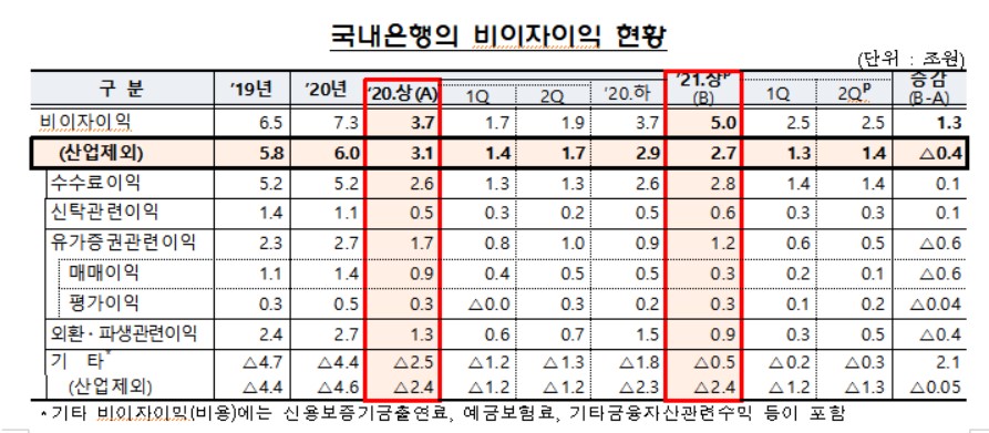 국내 은행권은 이자수익에 비해 비이자수익 실적이 미미해 은행 수익의 편중현상이 나타나고 있다. 금감원에 따르면 올해 상반기 국내은행의 비이자이익은 5조원으로 전년 동기 3조7000억원 대비 1조3000억원 증가했지만 산업은행을 제외한 18개 은행 기준으로는 비이자이익이 2조7000억원으로 오히려 4000억원 감소했다. 산업은행의 비경상적 이익을 제외하면 오히려 지난해보다 감소한 것으로 나타나 은행 수익의 편중 현상이 여전히 해소되지 못하고 있는 상황.