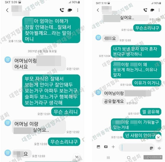 대한아동학대방지협회(협회)는 29일 공식 카페를 통해 지난 6월13일 계부 양모(29)씨와 장모가 나눈 문자 메시지 일부를 공개했다.