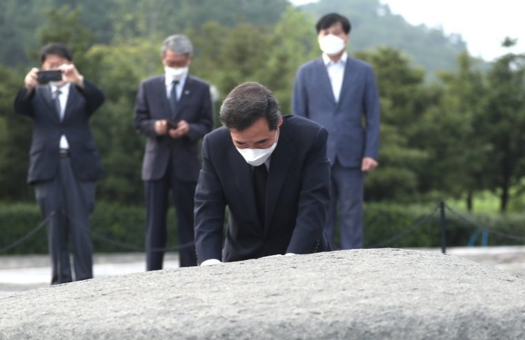 그는 헌화 후 너럭바위로 이동해 묘역에서 10여 초간 무릎을 꿇기도 했다. 필연캠프 배재정 대변인, 오영환 수행실장 등 캠프 관계자들이 동행했다.