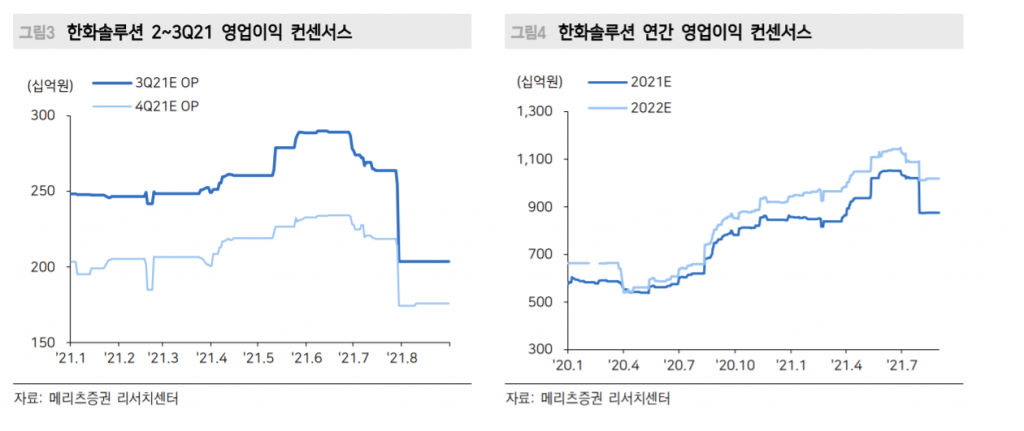 끝으로 노우호 메리츠증권 연구원은 “올해 11월 예정된 UN 기후협약회의에 앞서 태양광 산업에 투자 매력도는 여전히 높은 상황에서 정책 모멘텀에 따른 긍정적 주가 반등이 예상되지만, 올해 하반기 현실적 이익 체력을 고려한 한화솔루션의 투자 매력도는 중립”이라며 “기존 셀·모듈 수익성 악화에 따른 적자 기조는 현 주가에 부담”이라고 분석했다.