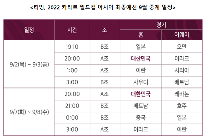 티빙은 대한민국이 속한 A조 경기 외에도, 일본, 중국, 베트남이 포함된 아시아 최종예선 B조의 주요 경기도 생중계할 예정이다.