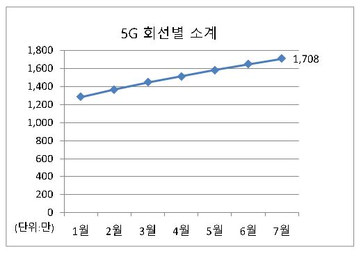 2일 과학기술정보통신부 무선통신서비스 가입현황 통계에 따르면 7월 말 기준 국내 5G 가입자는 1708만1846명으로 집계됐다. 전체 이동통신 가입자 수(7171만8898명) 중 5G 가입자 비율은 23.8%다.