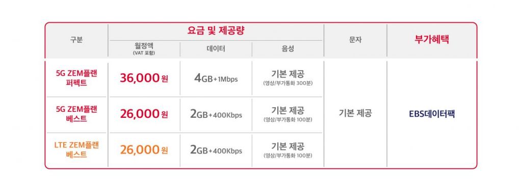 우선 5G 요금제는 월 3만6000원에 데이터 4GB를 제공하는 ‘5G ZEM플랜 퍼펙트’와 월 2만6000원에 2GB의 데이터를 제공하는 ‘5G ZEM플랜 베스트’ 총 2종을 선보인다.