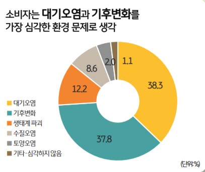 [아시아경제 박선미 기자]국내 소비자 대다수는 대기오염과 기후변화를 가장 심각한 환경 문제로 생각하고 있으며 절반 정도는 친환경 제품 구매 시 10% 이내 추가 비용을 낼 의향이 있는 것으로 드러났다.