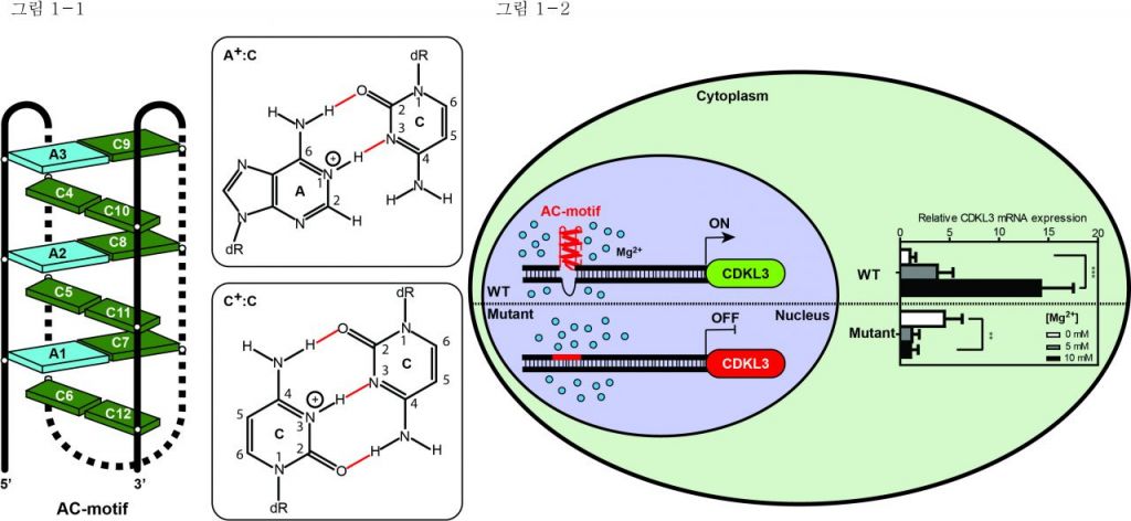 연구팀은 아데닌과 사이토신이 반복되는 염기서열이 마그네슘 존재 하에 4중 나선구조를 갖는다는 것을 발견해 이를 AC-motif라 명명했다. 아데닌과 사이토신이 반복되는 여러 종류의 올리고뉴클레오타이드를 합성하고 이들의 삼차구조 형성 및 금속이온의 영향을 연구해 AC-motif가 두 쌍의 이중나선이 엇갈린 4중 나선구조를 갖는다는 것을 확인한 것이다. 원편광이색 분광분석법(CD spectroscopy), 자기공명분광분석법(Nuclear Magnetic Resonance spectroscopy), 형광분광분석법(Fluorescence spectroscopy) 및 분자동력학 계산법이 동원됐다.