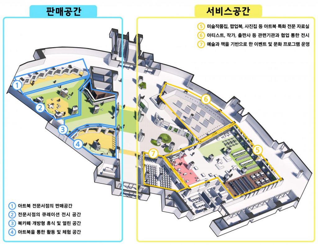 공간은 크게 서비스공간과 판매공간으로 구성되며 총 7개 공간이 들어선다. ▲서비스공간은 아트북 특화 전문 자료실 ▲아티스트·작가·출판사 등과의 협업 전시공간 ▲이벤트 및 문화 프로그램 공간이다. 판매공간은 ▲아트북 전문서점 판매공간 ▲전문서점의 큐레이션 전시공간 ▲북카페, 개방형 휴식 열린공간 ▲아트북을 통한 활동 체험 공간이다.