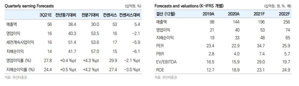3분기 계절적 성수기 효과로 매출액은 전년동기대비 30% 증가한 563억원, 영업이익은 156억원으로 53.4% 뛸 것으로 예상된다. 신규 플래그십 스마트폰 모델(아이폰13 시리즈, 갤럭시 Z폴드·플립3) 판매 호조로 시장 기대치를 상회하는 실적 달성 가능할 것으로, 특히 Z폴드·플립3의 수요 강세로 예상되며 생산량이 700만대를 상회할 것으로 관측된다. 이는 노트 시리즈 단종으로 인한 감소분을 훨씬 뛰어넘는 수준이다.