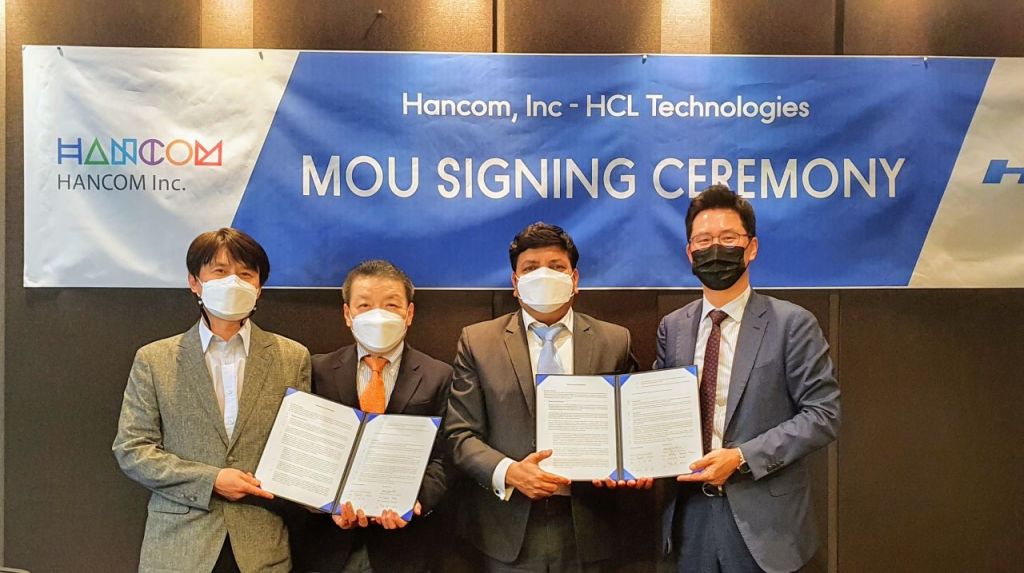 오른쪽부터 김대기 한컴 부사장, 하레쉬 쿼텀 HCL테크놀로지 한국사업개발 리더, 문준호 HCL테크놀로지 한국지사장, 손찬주 한컴 이사.