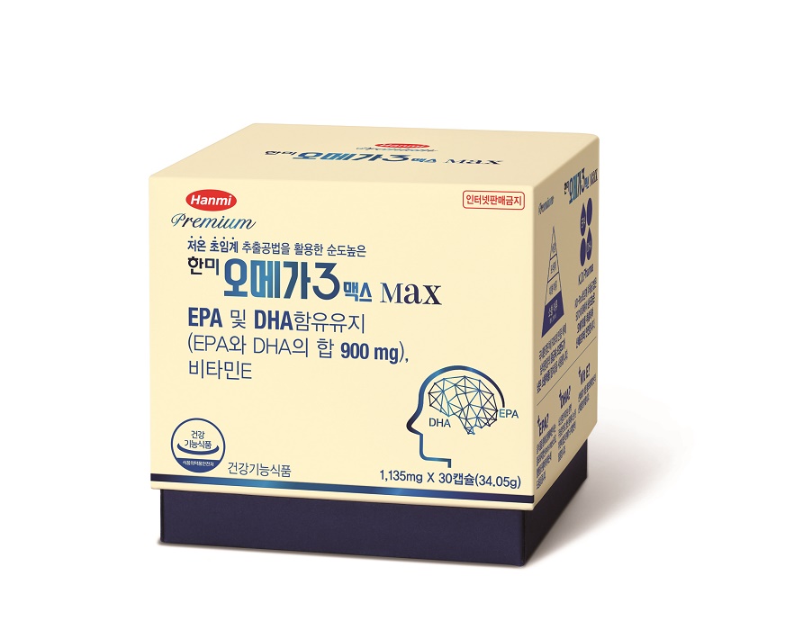 한미 오메가3맥스는 기억력 개선과 혈중 중성지질 및 혈행 개선, 안구 건조 개선 등에 도움을 주는 EPA·DHA가 900㎎ 함유돼 한 알만으로도 일일 권장량을 충족할 수 있다. 또 산패를 방지하고, 유해산소로부터 세포 보호를 돕는 비타민 E도 함유됐다.