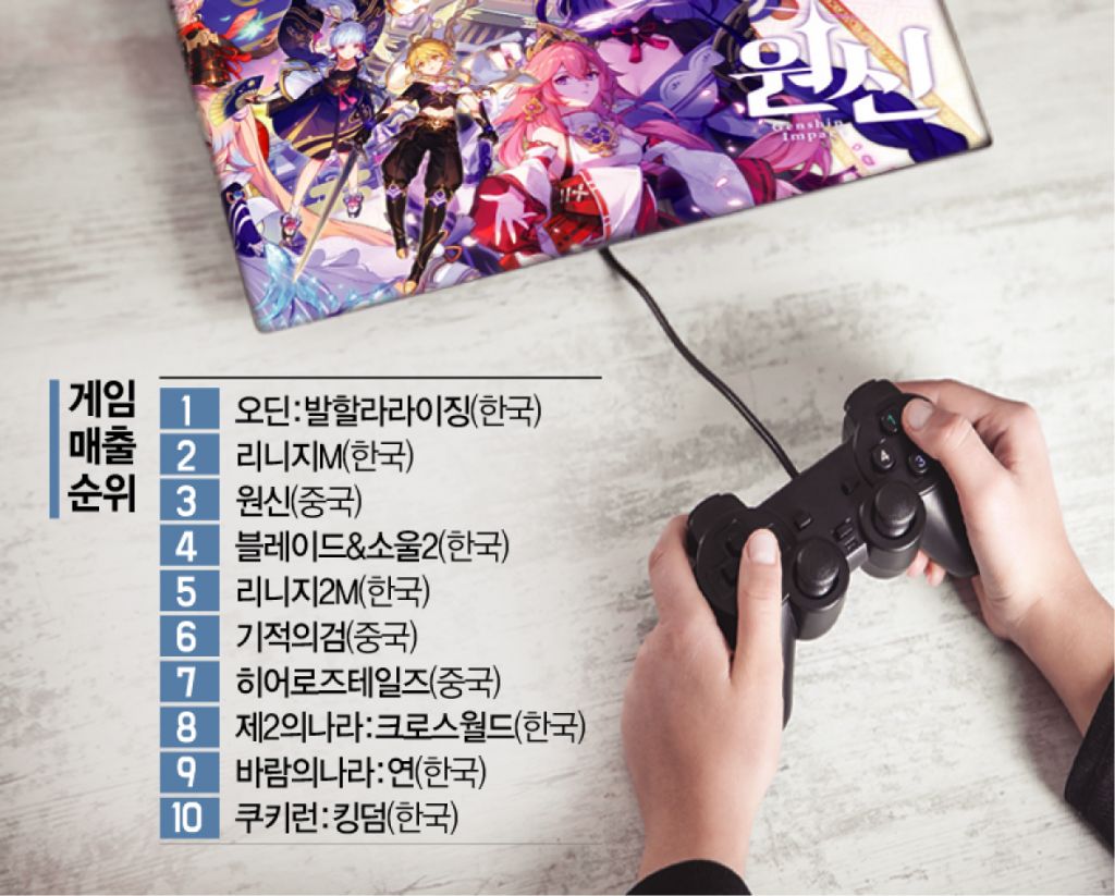 8일 게임업계에 따르면 중국 게임사 미호요의 ‘원신’이 엔씨소프트의 리니지2M을 밀어내고 구글플레이 매출 순위 3위를 기록했다. 엔씨의 리니지2M은 5위를 기록중이다. 최상위권을 벗어난 적이 없었던 리니지2M은 원신의 1주년 업데이트 효과로 중국 게임에까지 밀리는 신세가 됐다. 과거 ‘짝퉁’ 취급을 받던 중국 게임들은 무서운 기세로 한국 게임시장을 장악하고 있다. 이날 오전 구글플레이 기준 상위 10위에서 중국 게임의 비중은 30%에 달한다. 원신을 비롯해 4399의 ‘기적의 검’(6위), 37게임즈의 ‘히어로즈 테일즈’(7위) 등이다.