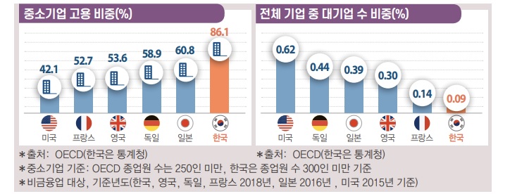한경연에 따르면 한국의 전체 기업 가운데 대기업 수 비중은 0.09%로 미국(0.62%)과 비교해 7분의 1 수준에 불과했다. 독일은 0.44%, 일본은 0.39%, 영국은 0.30%, 프랑스는 0.14%로 주요 5개국(G5)의 비중이 우리보다 높았다.