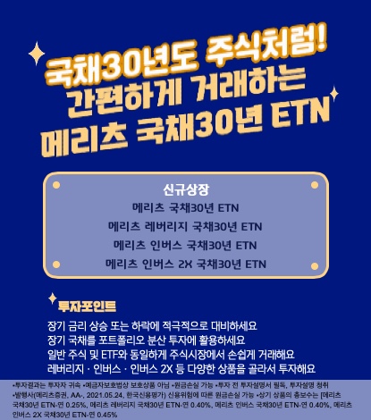 해당 상품은 ‘메리츠국채30년ETN’, ‘메리츠레버리지국채30년ETN’, ‘메리츠인버스국채30년ETN’과 ‘메리츠인버스2X국채30년ETN’이다.