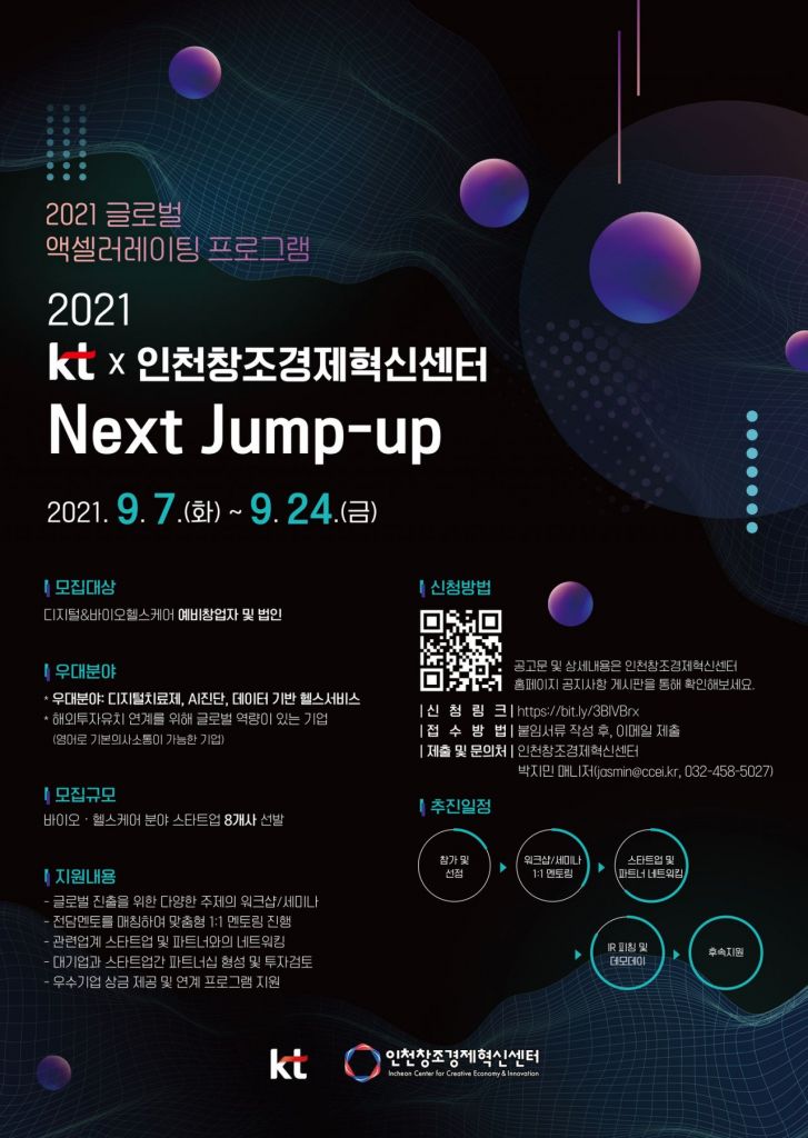 [아시아경제 조슬기나 기자] KT는 인천창조경제혁신센터와 손 잡고 디지털, 바이오헬스케어 분야의 ‘차세대 유니콘’이 될 유망 스타트업을 발굴, 육성하는 전문 엑셀러레이팅 프로그램 ‘넥스트 점프업(Next Jump-up)’을 시행한다고 10일 밝혔다.