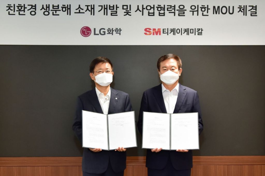 LG화학은 지난 10일 여의도 LG트윈타워에서 삼라마이다스(SM)그룹의 자회사인 티케이케미칼과 ‘친환경 생분해 소재(PBAT) 개발 및 사업협력을 위한 업무협약(MOU)’를 체결했다고 12일 밝혔다.