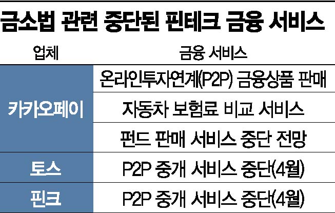 핀테크 업체들은 금융당국이 금소법 강화 방침을 정하면서 관련된 서비스를 속속 중단해 왔다. 지난달 카카오페이와 뱅크샐러드는 개인 간 거래(P2P)금융상품 판매 서비스를 종료했고 올해 4월에는 토스와 핀다 또한 각각 P2P 서비스를 내렸다.