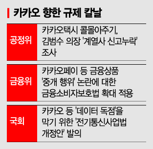 금융업계에서도 카카오를 향한 규제 분위기가 사그러들지 않고 있다. 카카오페이 등과 같은 금융플랫폼이 소비자 맞춤형 상품을 비교 추천하려면 금융소비자보호법에 따라 금융위원회에 등록을 해야 한다. 그동안 이들 금융플랫폼은 금융상품을 광고하는 것이라며 규제를 피했지만, 앞으로는 금융당국에서 규제하기로 했다.