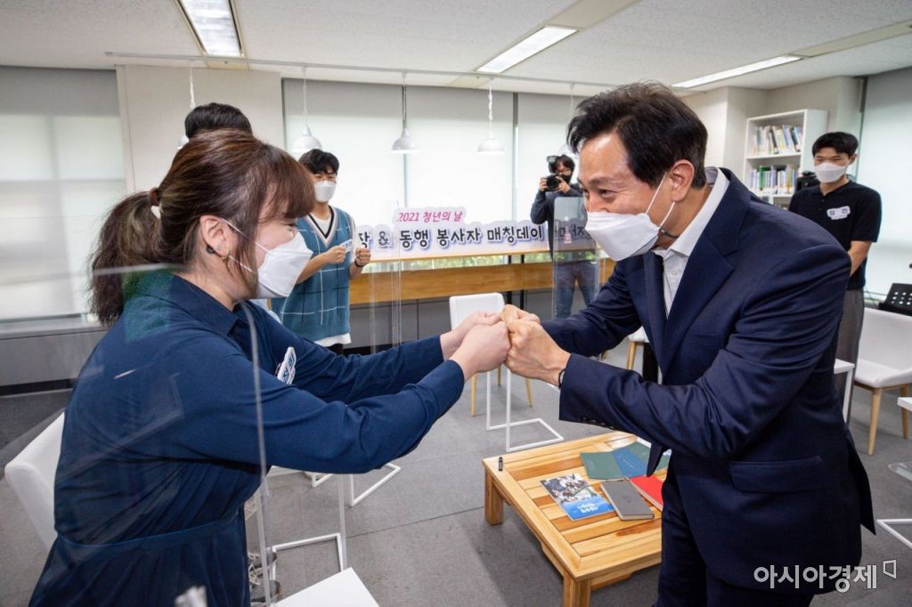 오세훈 서울시장이 13일 서울 마포구 서울시자원봉사센터에서 열린 '2021 청년의 날 서울시장-동행 봉사자 매칭데이'에 참석해 청년멘토들과 인사하고 있다./강진형 기자aymsdream@