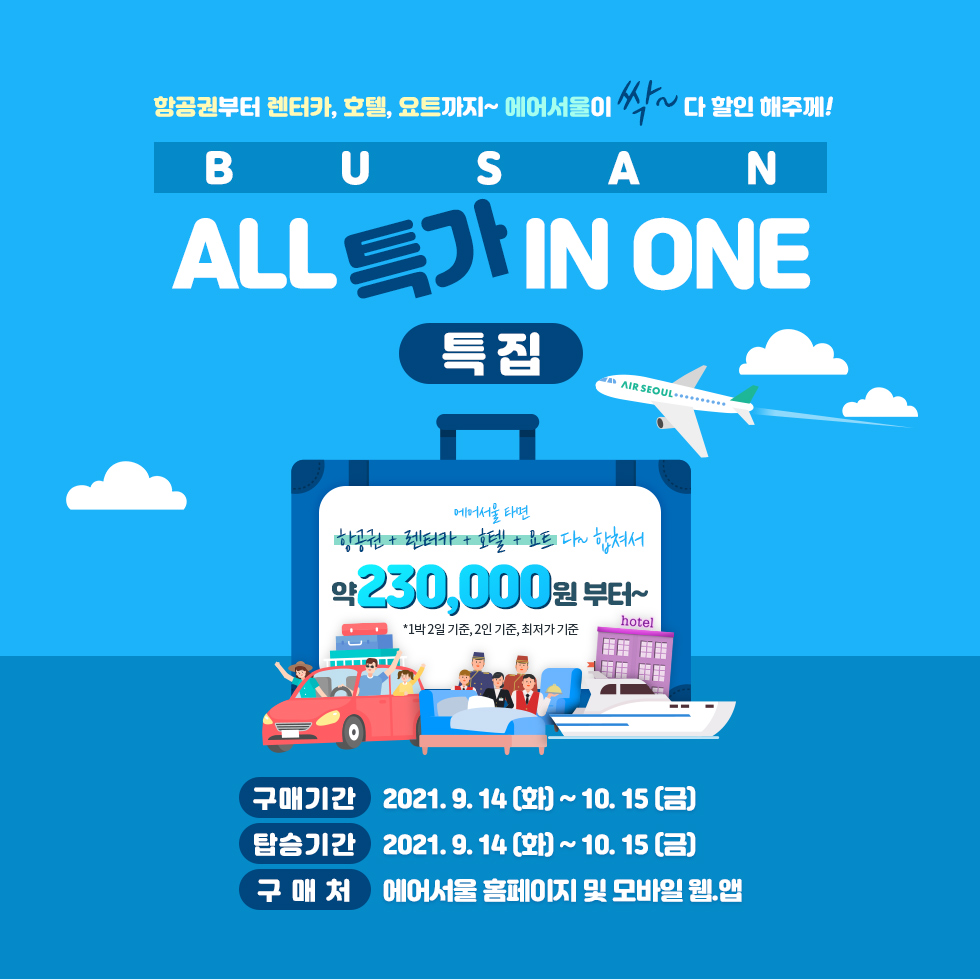 [아시아경제 이동우 기자] 에어서울은 부산 노선에서 ‘ALL 특가 IN ONE’ 프로모션을 실시한다고 14일 밝혔다.