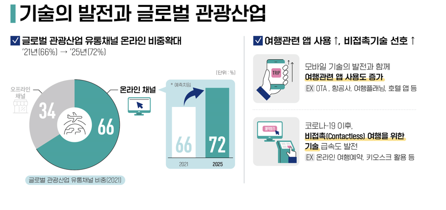 글로벌 OTA는 유망 중소 OTA 인수합병을 통해 지속적으로 대형화 되고있다. 지난해 기준 4개 OTA 그룹사(익스피디아, 부킹홀딩스, 트립닷컴, 에어비앤비)가 온라인 여행시장의 97%를 과점하는 형태로 성장했다. 코로나19 위기와 글로벌 대형 OTA와의 치열한 경쟁에 놓인 국내 OTA는 숙박, 항공, 여행상품 등 다양한 분야로 예약서비스가 확대됐다. 전통적인 여행사의 OTA 전환과 관광벤처기업의 트래블테크 기업화도 더욱 빠르게 진행되고 있다.