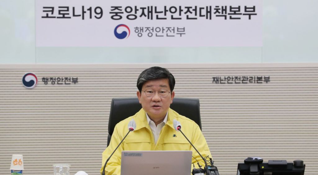 전해철 중앙재난안전대책본부 2차장(행정안전부 장관)이 15일 오전 세종시 정부세종2청사에서 열린 코로나19 대응 중앙재난안전대책본부 회의를 주재하며 발언하고 있다. [이미지출처=연합뉴스]