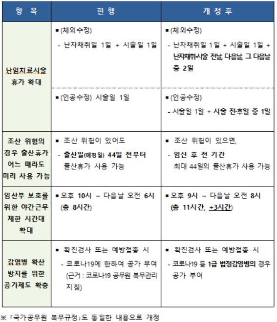 임신 중이거나 출산 후 1년이 지나지 않은 여성 공무원에게 초과근무를 명할 수 없는 시간대가 확대된다. 현재는 오후 10시~다음날 오전 6시까지 임산부 보호를 위한 야간근무가 제한되고 있다. 하지만 이번 개정으로 오후 9시~다음날 오전 8시까지 총 11시간 동안은 야간근무가 제한된다.