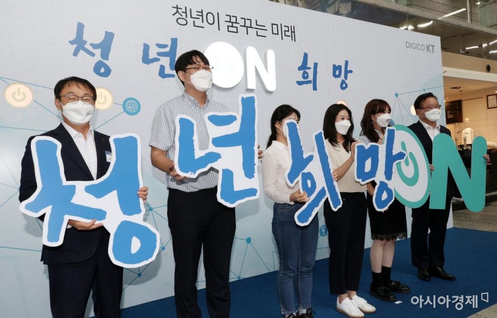 구현모 KT대표이사(맨 왼쪽)가 지난 7일 김부겸 국무총리(맨 오른쪽) 등이 참석한 가운데 서울 서초구 KT융합기술원에서 열린 '청년희망ON' 프로젝트 간담회 직전 참석자들과 기념촬영을 하는 모습./김현민 기자 kimhyun81@