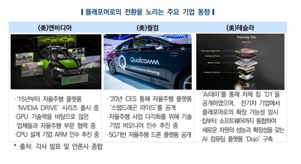 보고서는 이들 플래포머가 반도체부터 자율주행 소프트웨어까지 전 분야를 패키지화해 자율주행이 필요한 자동차 업체에 턴키 방식으로 공급해 시장 지배력 강화와 수익 극대화 추진 가능하다고 강조했다.