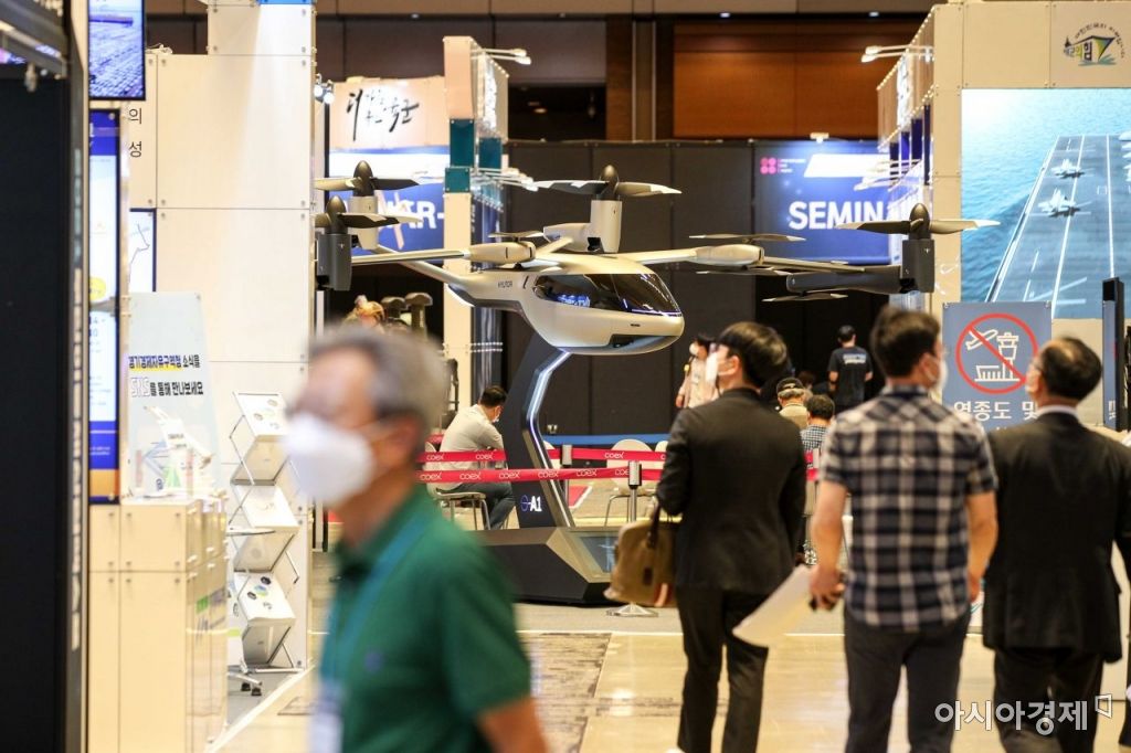 26일 서울 강남구 코엑스에서 열린 '2021 무인이동체산업엑스포'에서 다양한 드론 및 무인이동체가 전시되고 있다./강진형 기자aymsdream@