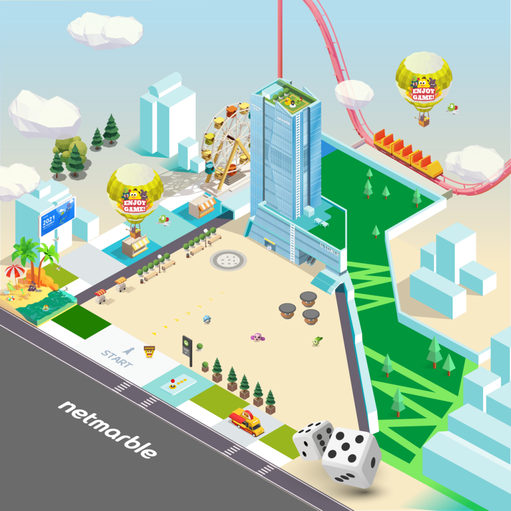 넷마블 타운은 넷마블 신사옥 ‘G타워(지타워)’를 배경으로 로비, 컨퍼런스 홀, ㅋㅋ다방, 외부 공원, 41층 루프탑 등 가상 공간으로 구성돼 있다.