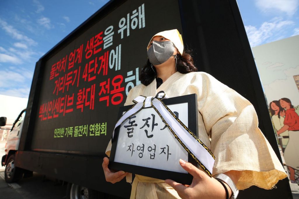 돌잔치 업체 관계자 500여 명이 모인 안전한 가족 돌잔치 연합회는 27일 오전 정부서울청사 앞에서 기자회견을 열고 "거리두기 4단계 장기화로 돌잔치 관련 자영업자들의 생계가 끊겨 경제적 피해가 심각한 상황이라 1인 시위에 나섰다"고 밝혔다.