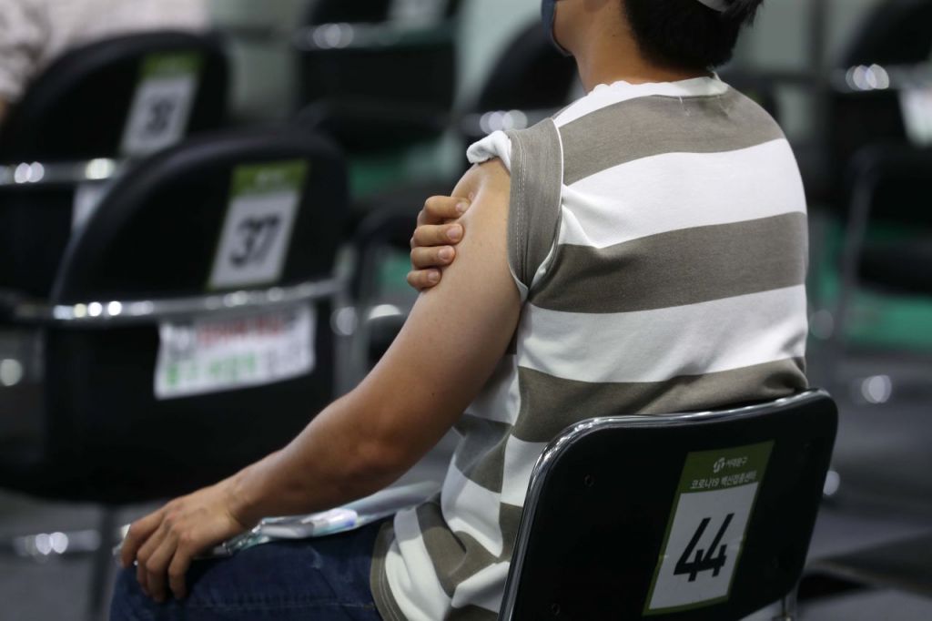 코로나19 확산세가 이어지고 있는 27일 서울 서대문구 북아현문화체육센터에 마련된 예방접종센터에서 백신을 맞은 시민들이 이상반응 모니터링 구역에서 대기하고 있다. /문호남 기자 munonam@