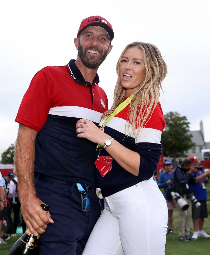 더스틴 존슨이 43회 라이더컵 우승 직후 아내 폴리나 그레츠키와 함께 기쁨을 나누고 있다.