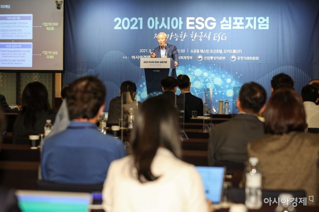 김종훈 SK이노베이션 이사회 의장이 29일 서울 중구 웨스틴조선호텔에서 열린 '2021 아시아 ESG 심포지엄'에 참석해 'ESG 시대, 우리는 어떻게 대응해야 하나?'란 주제로 기조연설 하고 있다./강진형 기자aymsdream@