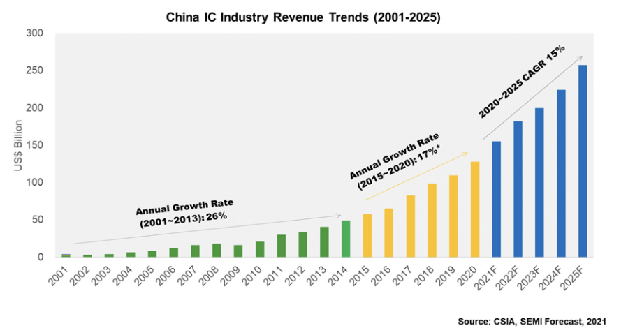 SEMI는 중국의 연평균 반도체 매출 성장률이 2020년부터 2025년까지 중국의 연평균 반도체 매출 성장률이 15%에 달할 것이라고 강조했다. 2000년대 이전까지만 해도 반도체 산업이 사실상 형성돼 있지 않았던 중국은 2001년부터 적극적인 투자를 해왔고 2001~2013년 연평균 26%, 2015~2020년 연평균 17%씩 시장이 성장했다.