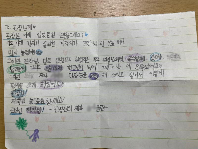 [아시아경제 권서영 기자] 학생들이 보는 앞에서 취객에게 폭행당한 부산의 한 태권도장 관장이 학생들로부터 응원 편지를 받았다고 밝혔다.