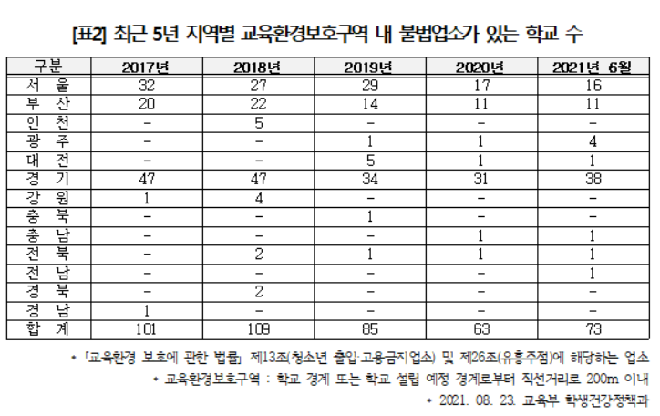 교육환경보호구역 인근 유해업소는 ▲2018년 109개 ▲2019년 85개 ▲2020년 63개로 점차 감소 추세였으나 올해 들어 상반기(6월 기준)에만 73곳으로 지난해 기준을 넘어섰다. 교육환경보호구역이란 학교 주변의 학습환경과 보건·위생 등을 보호하기 위해 학교 경계로부터 직선거리 200m 이내의 지역에 특정 행위나 시설 설치를 금지하는 구역을 말한다.