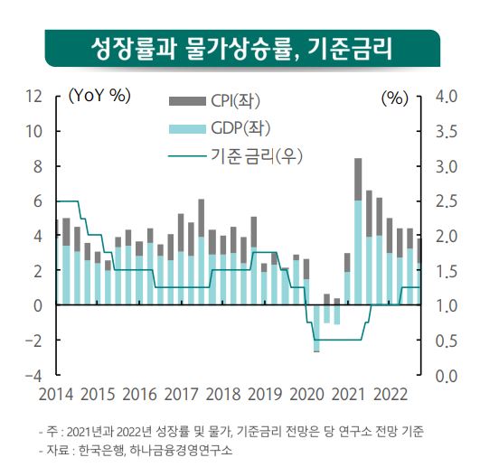 7일 하나금융경영연구소가 발표한 ‘2022년 경제·금융시장 전망’보고서에 따르면 기준금리가 경기회복과 금융불균형 누증을 감안해 올해 4분기와 내년 3분기 추가로 인상될 것으로 전망했다.