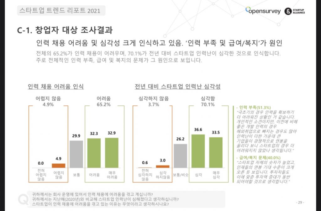 스타트업 창업자 10명 중 7명은 지난해보다 인력난이 심화됐다고 느끼는 것으로 나타났다. 지난해 코로나19로 주춤했던 스타트업 생태계는 다소 긍정적인 분위기로 전환됐지만 인력난과 투자 유치는 여전히 해결해야 할 숙제로 남아있다.