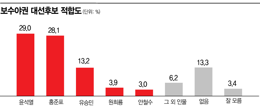 홍준표 국민의힘 의원은 28.1%로 지난 조사 대비 5.4%포인트 하락했다. 이어 유승민 전 의원 13.2%, 원희룡 전 제주도지사 3.9%, 안철수 국민의당 대표 3.0% 순으로 나타났다.