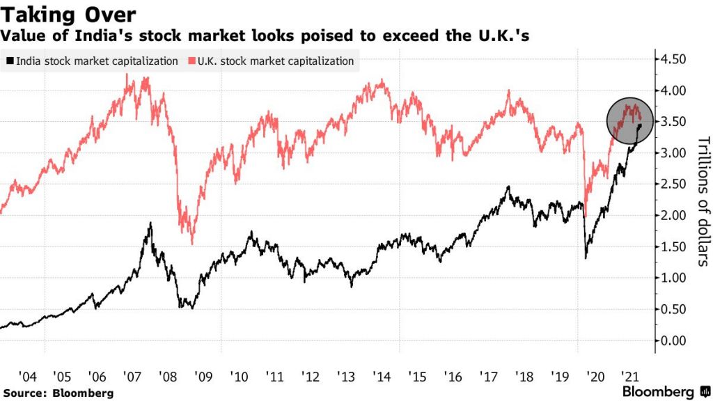 올해 인도 주식시장 시가총액은 37% 증가해 3조4600억달러로 늘었다. 사상 최저 수준의 기준금리와 개인 투자자들의 유입으로 최근 인도 주식시장은 연일 사상 최고치를 갈아치우고 있다. 반면 영국 주식시장의 시가총액은 3조5900억달러 수준이며 올해 상승률은 9%에 불과하다. 인도 증시가 향후 4%만 더 오르면 영국 증시를 제칠 수 있다.